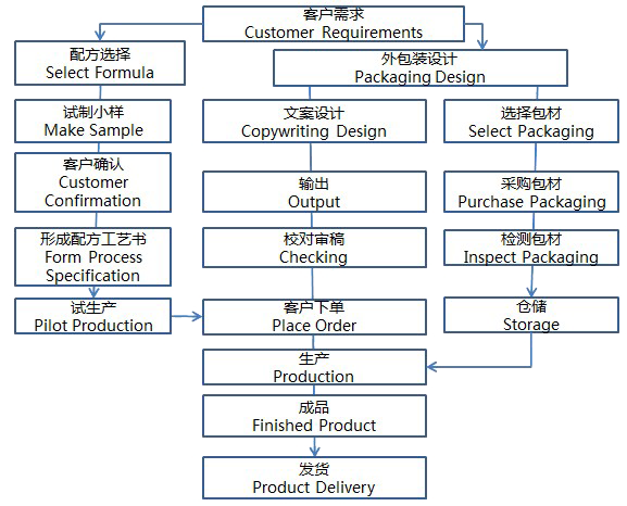 配方研發(fā)、包材原料采購(gòu)、VI設(shè)計(jì)、產(chǎn)品灌裝、產(chǎn)品送檢、三證提供的全過(guò)程。