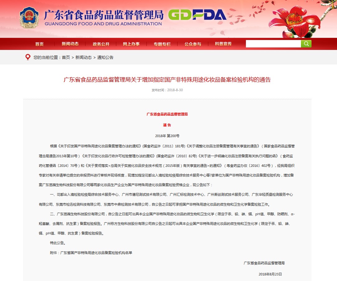 8月23日,廣東省食品藥品監(jiān)督管理局組織專家對有關(guān)申請單位提交的申報資料進行審核并現(xiàn)場核查,增加備案廣州棟方生物科技股份有限公司為國產(chǎn)非特殊用途化妝品備案檢驗資格企業(yè),廣州棟方生物科技股份有限公司自公告之日起可出具本企業(yè)國產(chǎn)非特殊用途化妝品的微生物和衛(wèi)生化學(xué)(限定于汞、鉛、砷、鎘、pH值、甲醇、抗生素)備案檢驗報告。詳細內(nèi)容請見《廣東省食品藥品監(jiān)督管理局通告》(2018年第200號)
