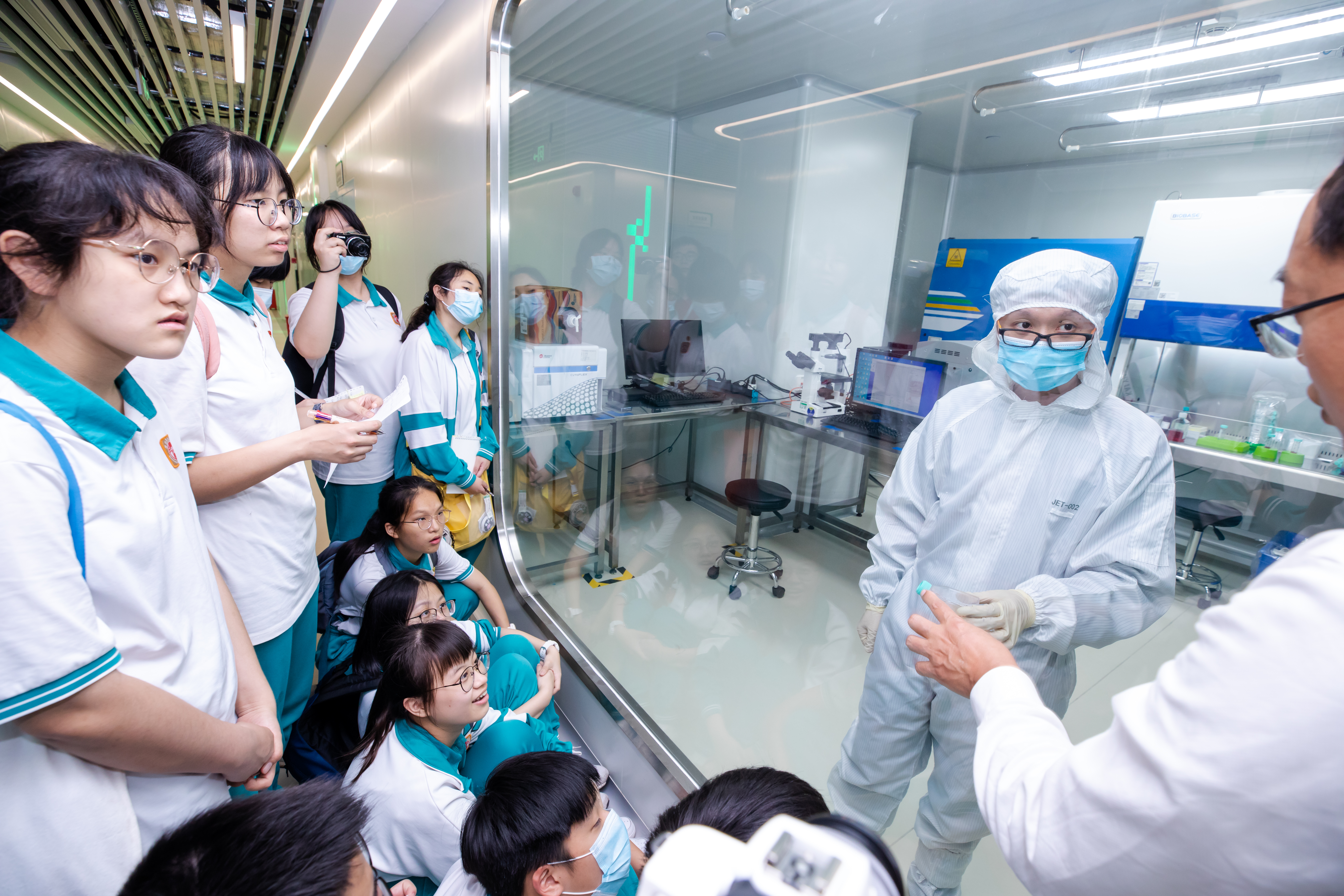 此次研學(xué)之旅,廣州開(kāi)元學(xué)校師生不僅參觀了潔特生物的沉浸式生命科學(xué)體驗(yàn)廳,還前往生產(chǎn)一線了解潔特生物最先進(jìn)的無(wú)人工廠與智能化設(shè)備。同時(shí),他們還來(lái)到潔特檢測(cè)中心,通過(guò)高精密的儀器設(shè)備與細(xì)胞零距離“見(jiàn)面”。