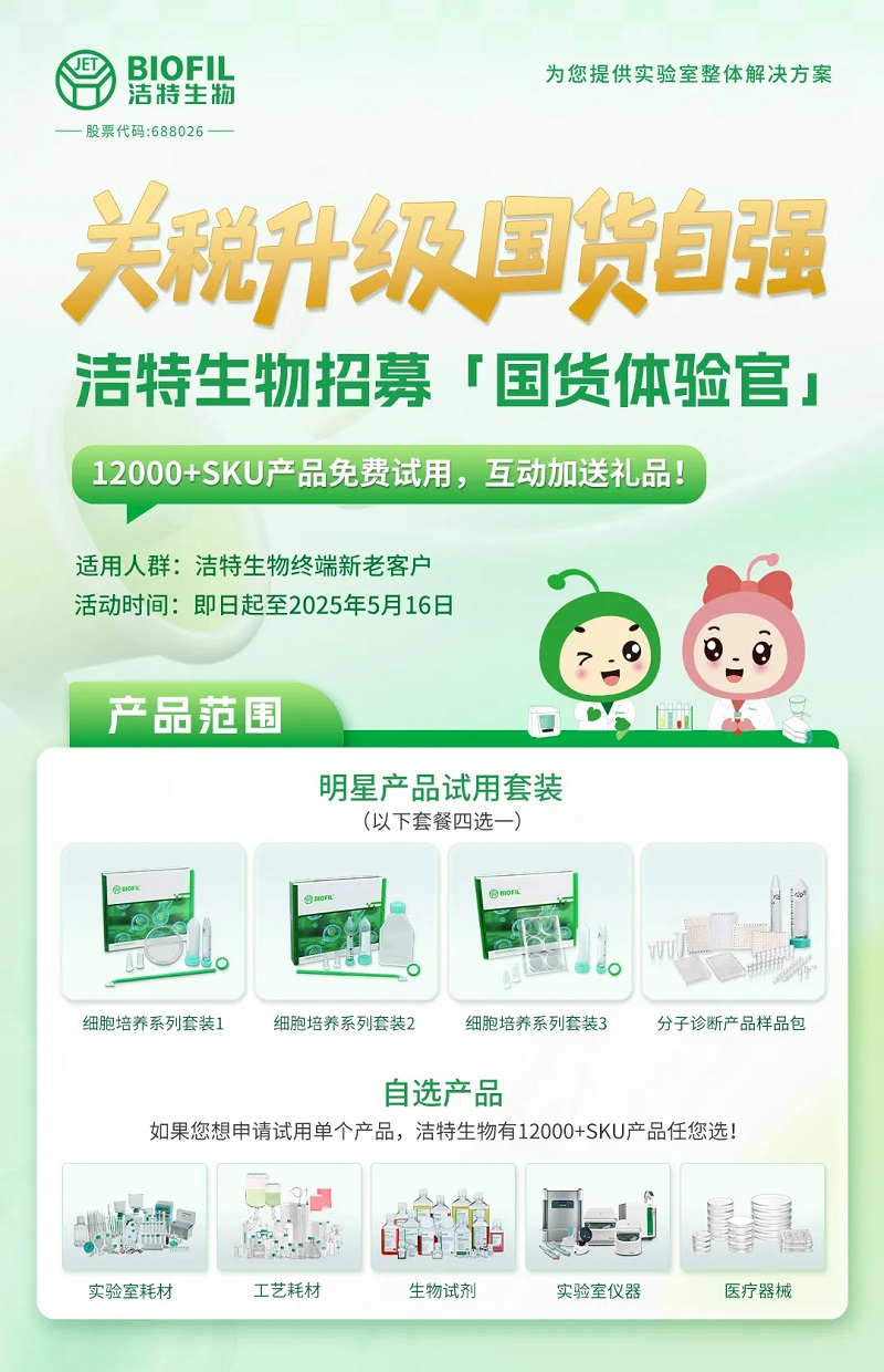 如果您想申請試用單個產(chǎn)品,潔特生物有12000+SKU產(chǎn)品任您選!涵蓋生物實(shí)驗(yàn)室耗材、生物工藝耗材、生物試劑、實(shí)驗(yàn)室儀器、醫(yī)療器械。