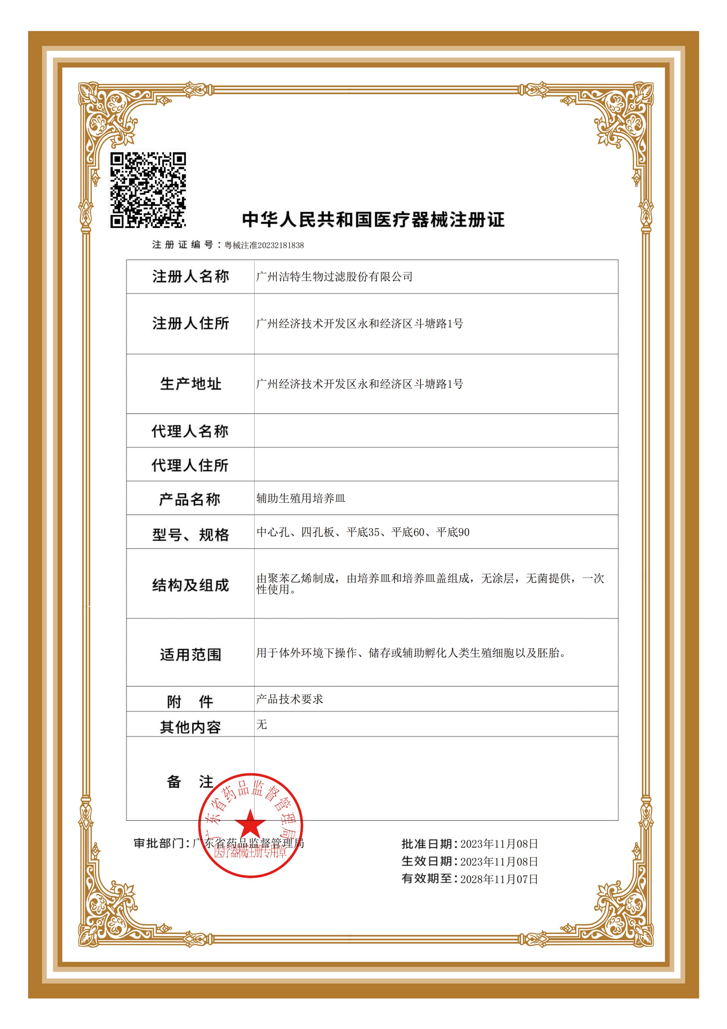 2023年11月8日,潔特生物IVF專用培養(yǎng)器皿正式獲得國(guó)家食品藥品監(jiān)督管理局(NMPA)頒發(fā)醫(yī)療器械注冊(cè)證(注冊(cè)證編號(hào):粵械注準(zhǔn)20232181838)。